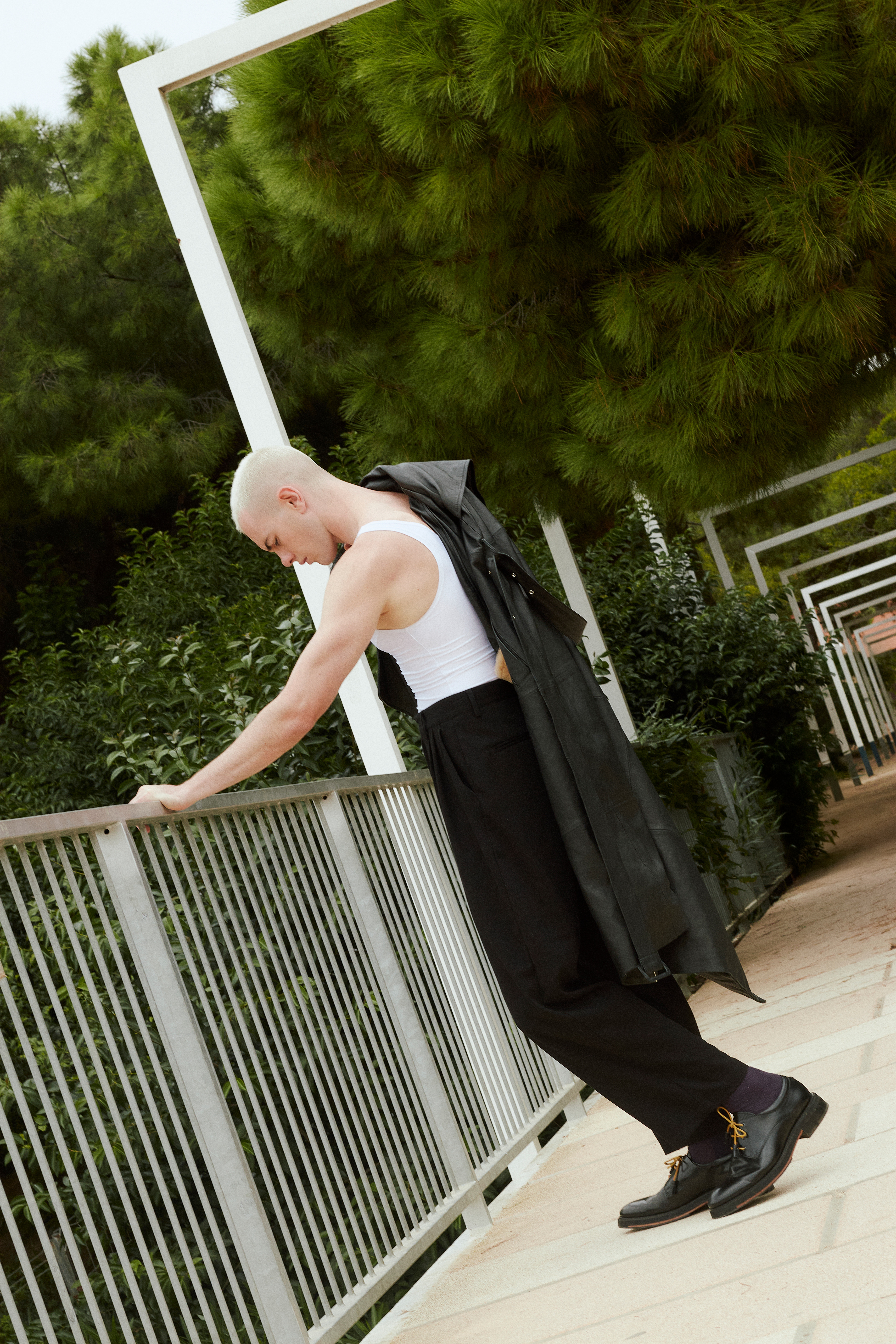 Top — ALSEDÀ, Leather Jacket — NAJJAT HARB, Pants — KARL LAGERGELD, Socks — CALVIN KLEIN, Shoes — PABLO ERROZ.