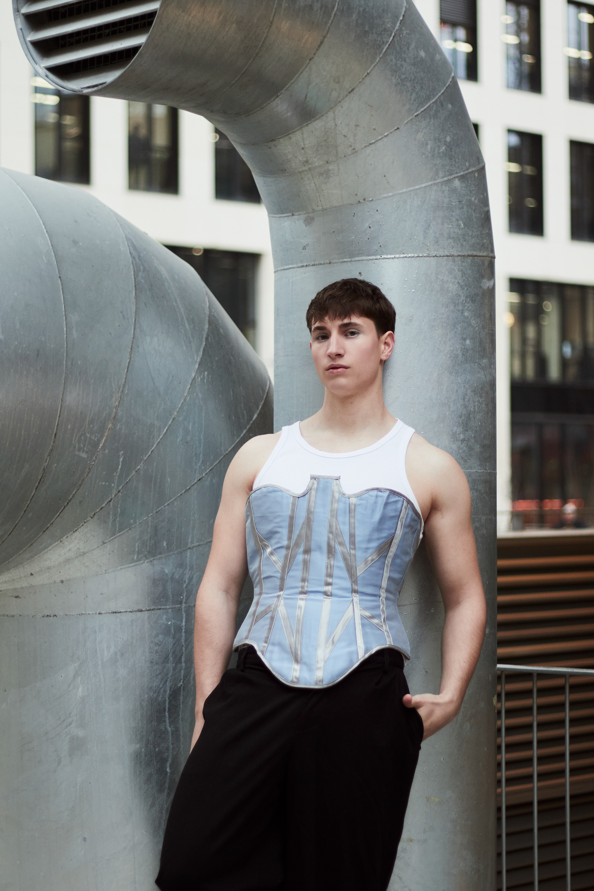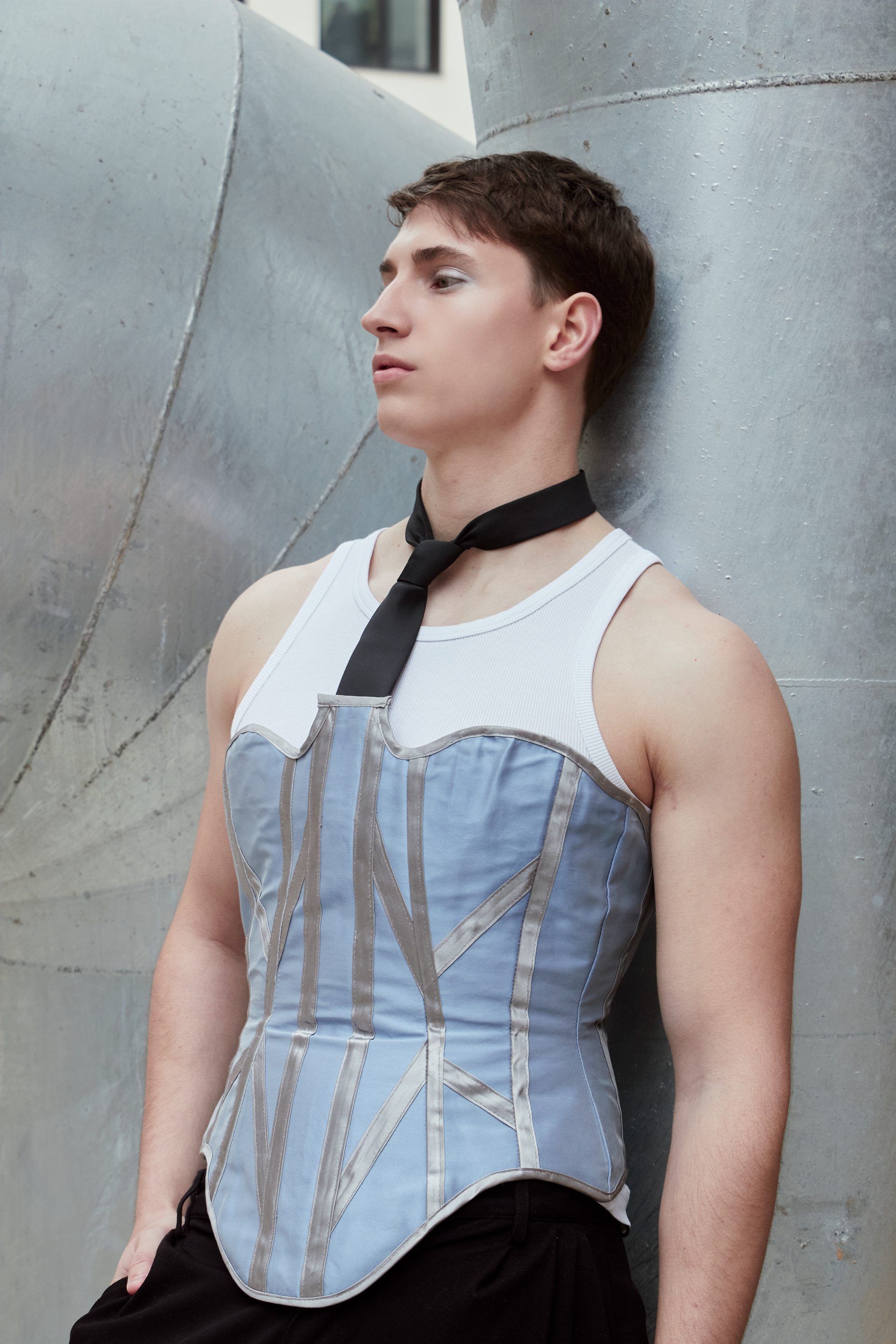 Jacket — LEMĀCHET, Shirt — Calvin Klein, Corset — MAISON MONSIEUR, Pants — Karl Lagerfeld, Shoes — Adidas.
